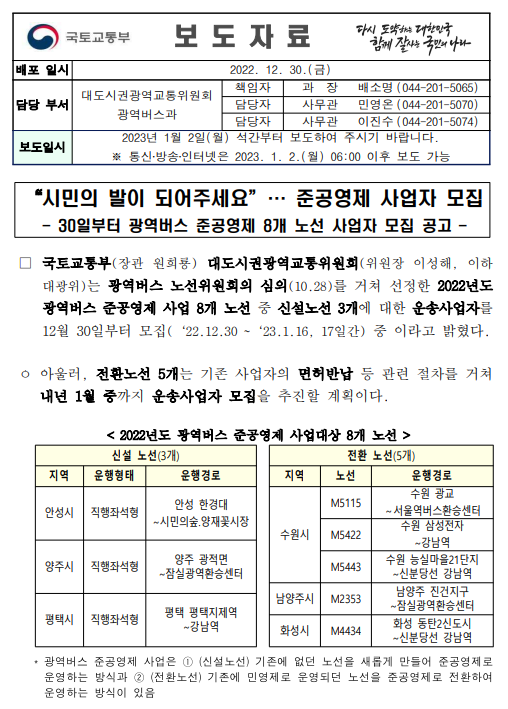 국토교통부 장관 (원희룡 장관) 대도시권 광역 교통위원회는 광역버스 노선위원회의 심의를 거쳐 선정한 2022년 광역버스 준공영제 사업 8개 노선 중 신설노선 3개에 대한 운송사업자를 12월 30일부터 모집 (22.12.30 ~ 23.01.16) 중이라고 밝혔다. 아울러 전환 노선 5개는 기존 사업자의 면허반납 등 관련 절차를 거쳐 내년 1월 중까지 운송사업자 모집을 추진할 계획이다. 이번 운송사업자를 모집하는 신설 노선 3개의 특징은 다음과 같다