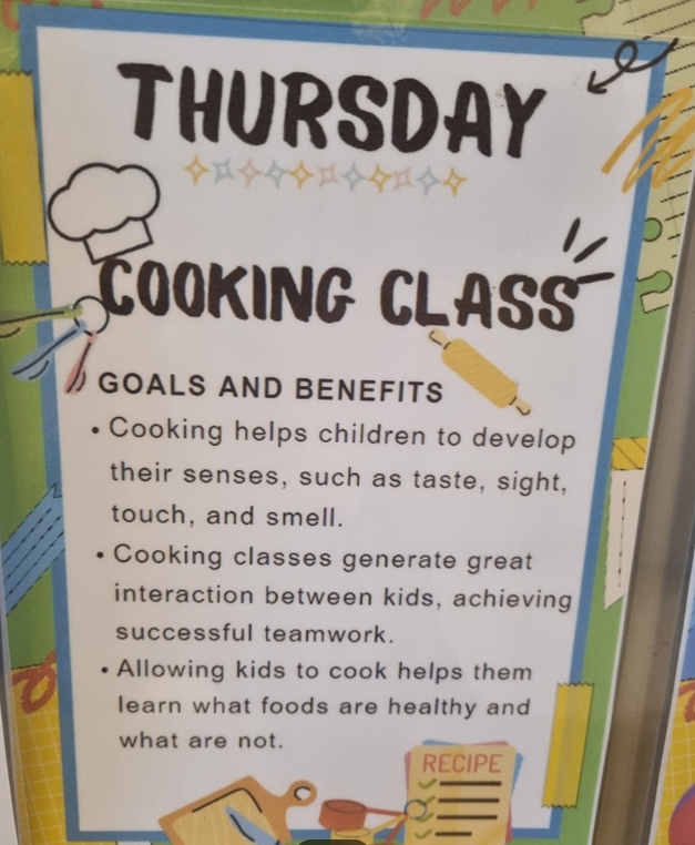 하루 9-6 수업으로 자체 복습시간, 그리고 1:1 , 1:4 , 1:8 엑티비티 (쿠킹클레스, 수영, 춤추기) 등 다양한 활동이 이어집니다.